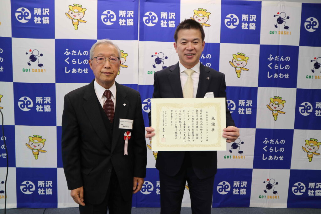 寄贈式にて感謝状を頂きました。 埼玉りそな銀行所沢支店様の「開設130周年記念私募債キャンペーン」を通じ、所沢市内の子ども食堂等の支援に貢献したとして感謝状を頂きました。 埼玉りそな様、所沢市社会福祉協議会様、誠にありがとうございます! 今後ともより街づくりに貢献できるよう、テクノスタッフ一同精進してまいります。